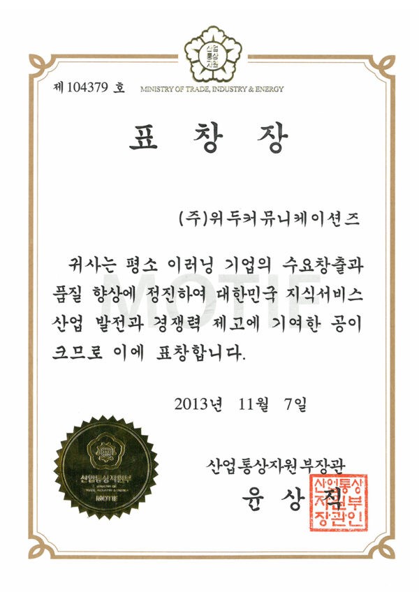 이러닝 기업의 수요 창출과 품질 향상 페이지 정보 작성자 WeDu 댓글 0건 조회 5,355회 작성일 19-05-30 19:32 본문 2013-11-07 표창장 제 104379호 이러닝 기업의 수요 창출과 품질 향상 산업통상자원부장관 윤상직 List Previous한국여성벤처협회 표창장 19.05.30 Next이러닝 콘텐츠 품질 인증 우수 심사 19.05.30