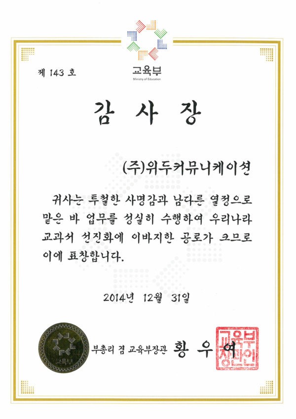 감사장 제 143호 페이지 정보 작성자 WeDu 댓글 0건 조회 5,498회 작성일 19-05-30 19:33 본문 2014-12-31 감사장 제 143호 교과서 선진화 부총리 겸 교육부장관 황우여 List Previous산업통상자원부 표창장 19.05.30 Next한국여성벤처협회 표창장 19.05.30
