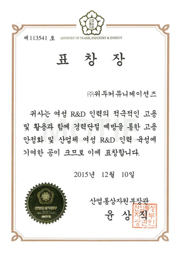 산업통상자원부 표창장 페이지 정보 작성자 WeDu 댓글 0건 조회 5,659회 작성일 19-05-30 19:34 본문 2015-12-10 표창장 제 113541호 여성 R&D 인력 고용 산업통상자원부장관 윤상직 List Previous서울클러스터 어워드 우수상 19.05.30 Next감사장 제 143호 19.05.30