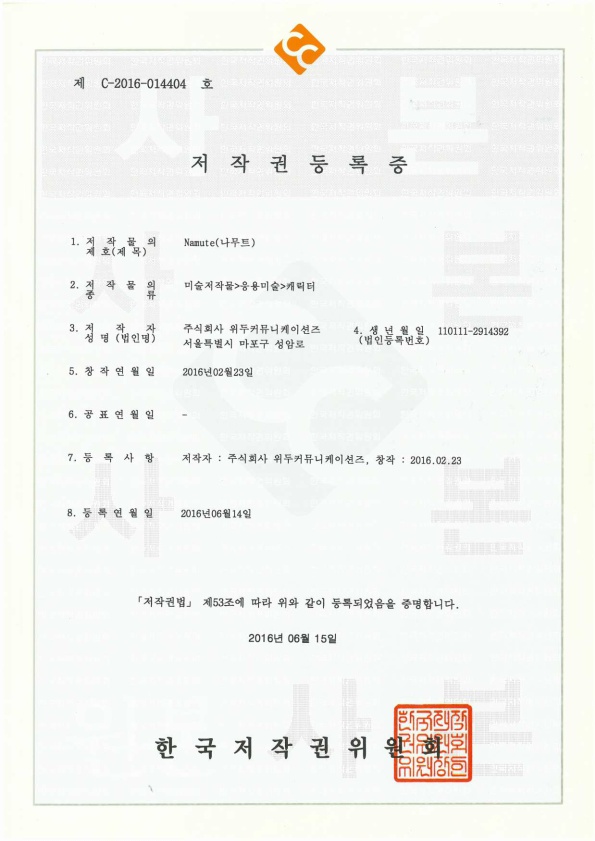 [한국/저작권] 나무트 페이지 정보 작성자 WeDu 댓글 0건 조회 5,694회 작성일 19-05-30 19:08 본문 2016-06-14 저작권 C-2016-014404 나무트 / 미술저작물>응용미술>캐릭터 List Previous[한국/저작권] 리안 19.05.30 Next[한국/저작권] 길리 19.05.30