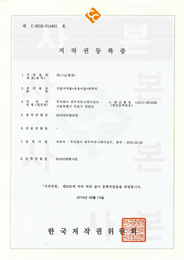 [한국/저작권] 필립 페이지 정보 작성자 WeDu 댓글 0건 조회 5,505회 작성일 19-05-30 19:09 본문 2016-06-14 저작권 C-2016-014401 필립 / 미술저작물>응용미술>캐릭터 List Previous[한국/저작권] 월터 19.05.30 Next[한국/저작권] 아리스 19.05.30