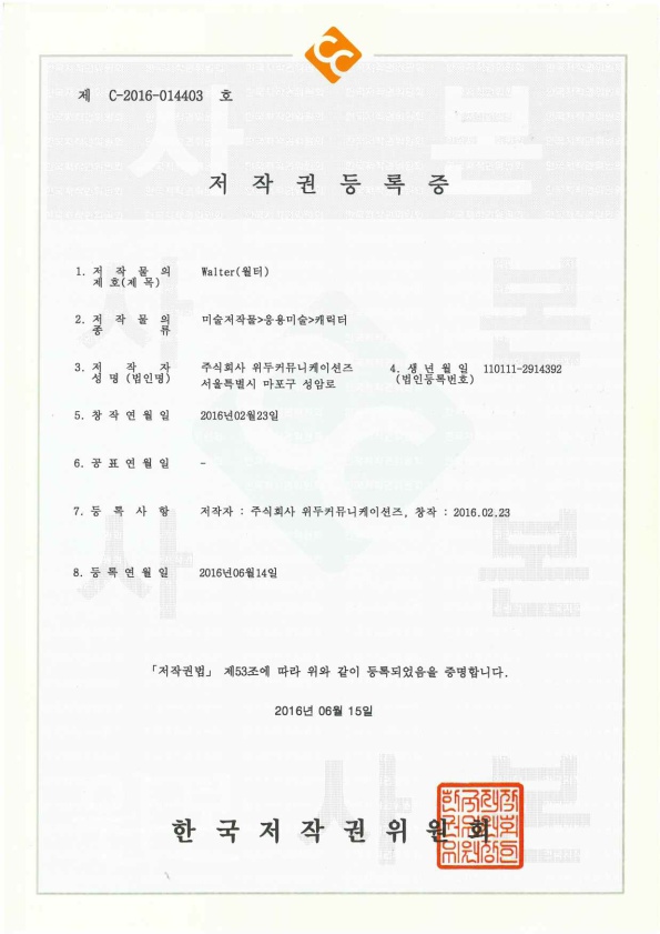 [한국/저작권] 월터 페이지 정보 작성자 WeDu 댓글 0건 조회 5,542회 작성일 19-05-30 19:09 본문 2016-06-15 저작권 C-2016-014403 월터 / 미술저작물>응용미술>캐릭터 List Previous[한국/저작권] 파벨 19.05.30 Next[한국/저작권] 필립 19.05.30