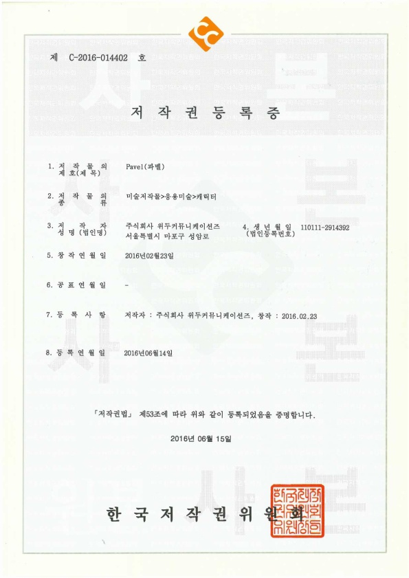[한국/저작권] 파벨 페이지 정보 작성자 WeDu 댓글 0건 조회 5,604회 작성일 19-05-30 19:11 본문 2016-06-15 저작권 C-2016-014402 파벨 / 미술저작물>응용미술>캐릭터 List Previous[한국/저작권] 누미 19.05.30 Next[한국/저작권] 월터 19.05.30