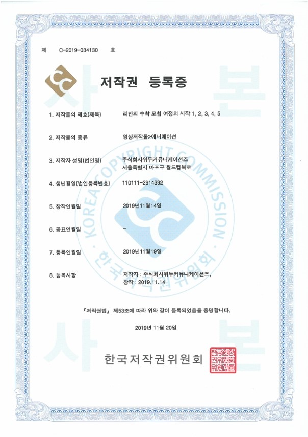 [한국/저작권] 리안의 수학 모험 여정의 시작 1,2,3,4,5 페이지 정보 작성자 WeDu 댓글 0건 조회 5,418회 작성일 21-12-31 12:36 본문 2019-11-20 저작권 C-2019-034130 영상저작물>애니메이션 List Previous[한국/저작권] OLL KIDS/MATH 21.12.31 Next[한국/저작권] 리안의 수학 모험 애니메이션 OST 19.11.25