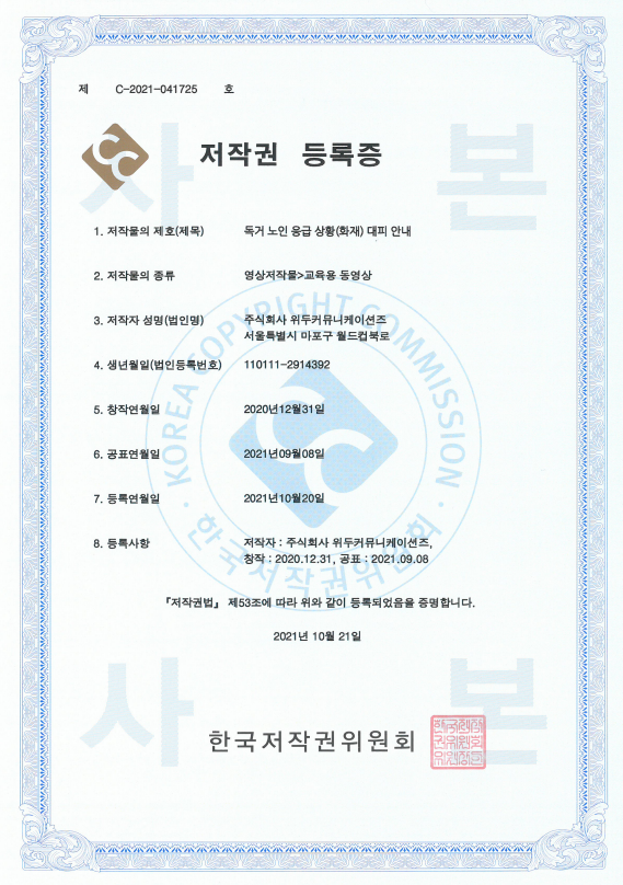 [한국/저작권] 독거 노인 응급 상황(화재) 대피 안내 페이지 정보 작성자 WeDu 댓글 0건 조회 5,854회 작성일 21-12-31 12:41 본문 2021-10-21 저작권 C-2021-041725 영상저작물>교육용 동영상 List Previous[한국/저작권] 장보기 인지훈련 게임 21.12.31 Next[한국/저작권] OLL KIDS/MATH 21.12.31